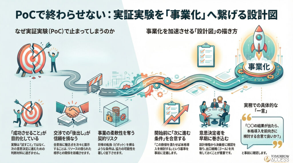 【結論】実験を始める前に「次に進む条件」を決め、交渉での「後出し」を避ける。実証実験は「成功させること」が目的ではない。