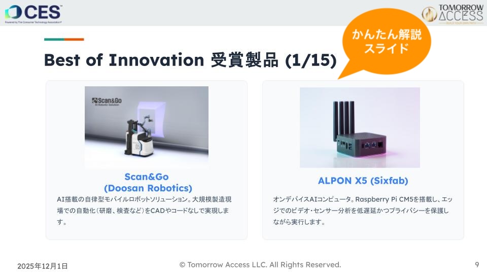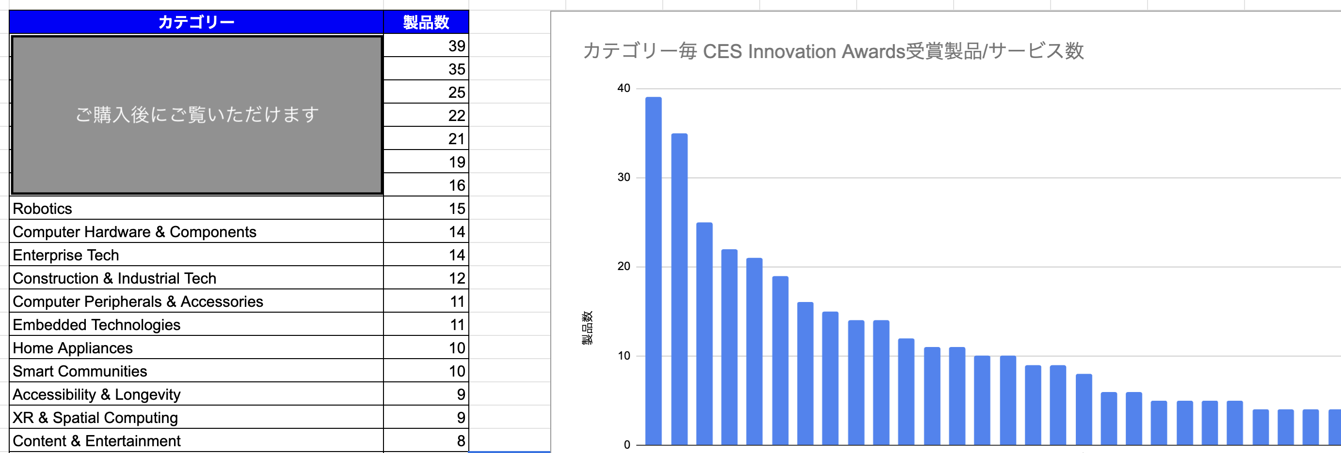 イノベーションアワードを受賞した全製品のリストを一目で見てわかりやすくGoogleスプレッドシート形式でご提供します。また、ベスト・オブ・イノベーションに選ばれた製品は、簡単な解説スライドをご提供!出張後のレポート作成にも役立ちます。